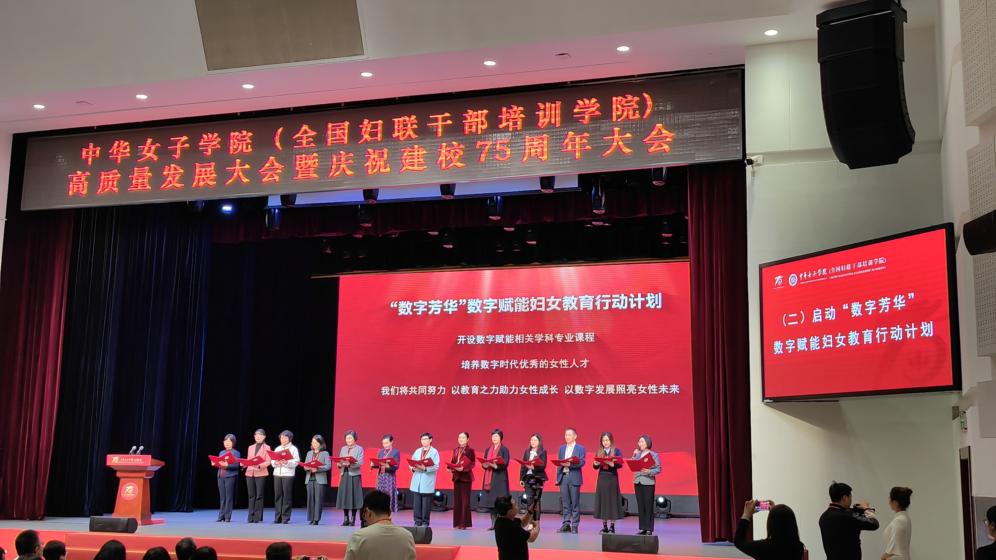 11 月16日上午,蔡院长参加中华女子学院高质量发展大会暨庆祝建校75周年大会。大会传达了国务委员、全国妇联主席谌贻琴同志对中华女子学院(全国妇联干部培训学院)的批示要求;中华女子学院(全国妇联干部培训学院)院长刘利群作了学校发展情况汇报;全国妇联党组书记、副主席、书记处第一书记黄晓薇作了重要讲话等。在发布“玫瑰绽放”女性数字赋能行动倡议环节,蔡院长上台参加“数字芳华”数字赋能妇女教育行动计划的启动仪式。